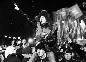 5日,烏克蘭首都基輔,一名亞努科維奇的支持者作勝利手勢。烏克蘭將于7日進(jìn)行總統(tǒng)大選第二輪投票。