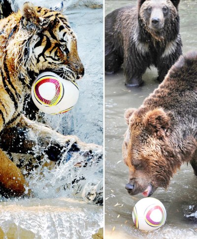 而在白天32度的高溫下,韓國(guó)京畿道龍仁愛寶樂園動(dòng)物園的老虎和熊也不甘落后,它們使用2010南非世界杯官方比賽用球“普天同慶”興致勃勃的玩起了水上足球。