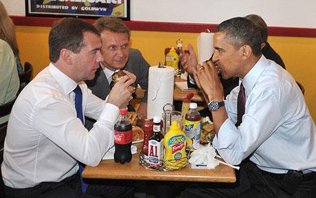 據(jù)美國媒體披露,奧巴馬點(diǎn)了一份傳統(tǒng)的起司漢堡和一瓶紅茶,梅德韋杰夫也點(diǎn)了一份起司漢堡和一瓶可樂,不過他在漢堡中加了一點(diǎn)墨西哥辣椒、蘑菇和洋蔥,兩人還分享一份薯?xiàng)l。兩位總統(tǒng)都脫去西裝,身著白色襯衫,奧巴馬習(xí)慣性地卷起袖子,擺出一副大快朵頤的樣子;梅德韋杰夫則保持俄式紳士的風(fēng)度,沒有卷起袖子。兩人相向而坐,一邊啃漢堡,一邊借助旁邊的翻譯“談笑風(fēng)生”。
