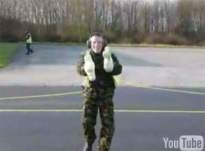 英皇家空軍軍官跑道上邊跳霹靂舞邊指揮飛機起飛
