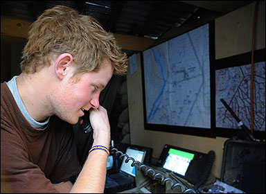 23歲的哈里王子在駐阿英軍第52旅下屬的皇室騎兵團作戰(zhàn)組服役,他在赫爾曼德省邊遠地區(qū)的任務(wù)是協(xié)調(diào)各種飛機的作戰(zhàn)行動,其中包括美國的F-15戰(zhàn)斗機、英國的“鷂”式攻擊機、阿帕奇武裝直升機、 C-130H“大力士”運輸機。他因此要和英國皇家空軍“鷂”式攻擊機女飛行員米歇爾-湯普金斯和她的同事們保持經(jīng)常性的接觸,飛行員只有在獲得他的批準后才能對目標(biāo)發(fā)動攻擊。