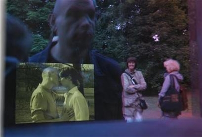 這個(gè)大型水泥方塊狀的紀(jì)念碑上有個(gè)小窗,游客可以通過(guò)這個(gè)小窗看見(jiàn)兩名男子親吻的影像。