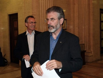 民主統(tǒng)一黨領(lǐng)袖佩斯利(左)和新芬黨領(lǐng)袖亞當(dāng)斯(右)共同出席記者招待會。