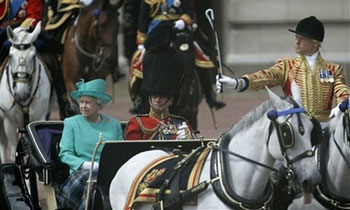據(jù)英國廣播公司報(bào)道,按照傳統(tǒng),女王夫婦搭乘開敞篷馬車抵達(dá)白金漢宮邊上的馬隊(duì)校閱場。王儲查爾斯王子和安妮公主則率馬隊(duì)跟隨。