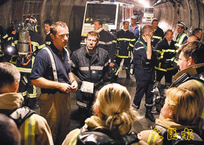 英法的消防員在緊急逃生管道集合,準備進入隔壁大火的列車管道撲救。