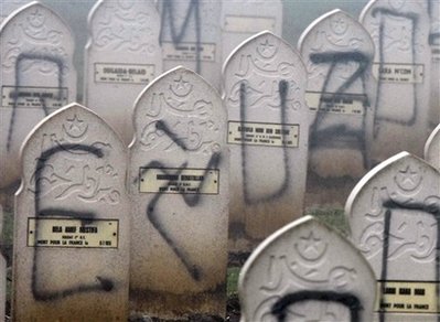 在法國東北部阿拉斯附近NOTRE-DAME-DE-LORETTE的法國最大軍人公墓里,有大約500多座墓碑被人涂上了納粹德國標(biāo)志和反穆斯林的口號(hào)。