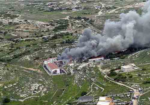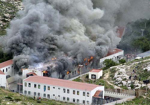 2月18日,在意大利南部蘭佩杜薩島,濃煙從一處移民收容中心升起。據(jù)當(dāng)?shù)鼐椒Q(chēng),當(dāng)天,一些被拘留在此的非法移民試圖逃跑失敗后,便縱火焚燒該收容中心,造成多人受傷。