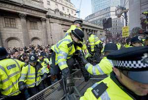 目前,有1200名示威者聚集在英格蘭銀行門口,進行抗議活動。為了防止更多的示威者接近央行,警察不得不動用大量防暴車輛將附近的道路團團圍住。而在倫敦西德尼德街與巴塞洛繆巷的交界處,眾多蒙面男子試圖闖過警察的封鎖線來進行抗議活動,遭到了警察的圍堵。這些蒙面男子則向警察投擲空易拉罐、水果和面粉。目前至少有一名警察的額頭被打破。面對警方派出的增援部隊,蒙面男子們大喊著“混蛋警察”、“這是我們的街道”等口號。就在警方維持秩序的同時,抗議隊伍的前排有一位示威者的額頭也被打破。而一位身著黑衣、戴著面具的男子則手持著一根木棒,試圖上前毆打警察。一位警官因被擊中被帶到僻靜處進行治療。