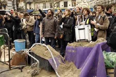 索邦大學(xué)(Sorbonne)學(xué)生們盛裝上演了一系列街頭活動(dòng),其中有學(xué)生身穿中世紀(jì)服裝,表演了場(chǎng)“薩科齊受審”的模仿劇。