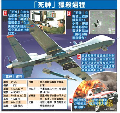據(jù)報(bào)道,“死神”體積大約是一架小型私人飛機(jī),而且可用常規(guī)跑道起飛。 “死神”可在戰(zhàn)區(qū)上空飛行14小時(shí),傳送高清圖象到地面,然后在數(shù)秒內(nèi)發(fā)動(dòng)空襲。