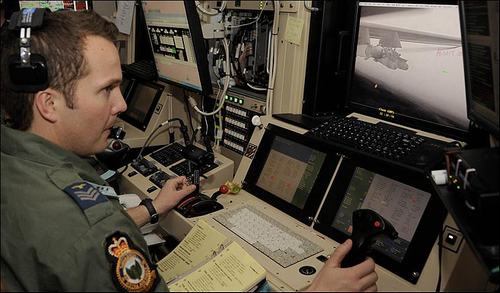 坐在扶手椅上的飛行員駐扎在美國(guó)內(nèi)華達(dá)沙漠基地中心的一間地面控制站內(nèi)。與電子游戲玩家一樣,他們使用一個(gè)手柄來操縱價(jià)值6百萬英鎊的無人機(jī),手柄上有一個(gè)開火鍵!笆崭钫摺睙o人機(jī)上的偵察攝像機(jī)能確定敵方狙擊手、恐怖分子隱藏地點(diǎn)的位置,干掉恐怖分子的機(jī)槍陣地、武器庫、路邊炸彈!笆崭钫摺睙o人機(jī)飛行員、32歲的基爾南中校來自諾丁漢。他說:“在這里,你每天都在前線,雖然距阿富汗有12874公里的距離,你每天都在這里執(zhí)行飛行任務(wù)以支援駐阿富汗的部隊(duì)!