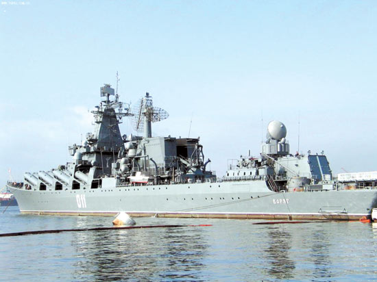 俄羅斯海軍也派出素有“航母殺手”之稱的“瓦良格”號導彈巡洋艦參加此次閱兵式。該艦已于13日從符拉迪沃斯托克的金角灣出發(fā)前往中國!巴吡几瘛碧柺嵌砹_斯太平洋艦隊的旗艦,主要武器為16枚SS-N-12超音速反艦導彈,可攜帶1000公斤裝藥的常規(guī)彈頭或射程達300海里的戰(zhàn)術核彈頭。