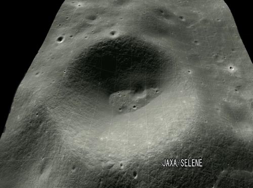 該畫像拍攝的區(qū)域?yàn)樵虑虮趁姹本?0至66度附近、寬約16公里、長約180公里的范圍,從中可見直徑約為60公里的“DYSON”隕石坑,還可看見附近的稍小一隕石坑內(nèi)側(cè)存在著更多的小型隕石坑。在南極附近拍下的圖像中,也可發(fā)現(xiàn)有許多隕石坑。