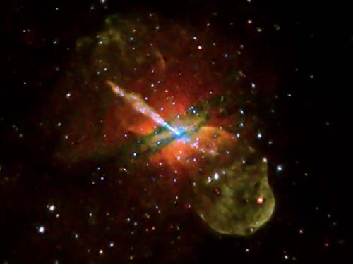 圖片中的左上角是一條延伸距離達(dá)1.3萬(wàn)光年的X射線噴射物,以及一條向反方向延伸的較短的“反向噴射”。天文學(xué)家認(rèn)為,這種動(dòng)力射流起到了重要的運(yùn)輸作用,把來(lái)自黑洞的能量傳遞到規(guī)模更大的星系,同時(shí)還影響那里恒星的速度。