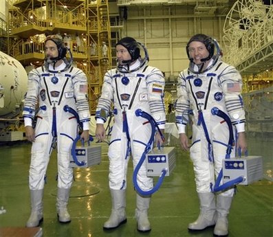 理查德-加里奧特(左)與兩位專業(yè)宇航員同伴身著太空服。