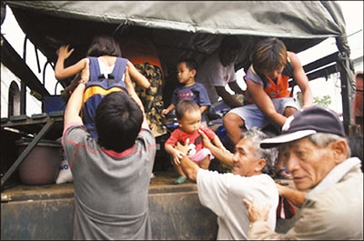 平板貨車、警方特許客貨車,甚至垃圾車均被征用接載災(zāi)民離開(見圖)?偨y(tǒng)阿羅約夫人縮短新加坡訪問回國。