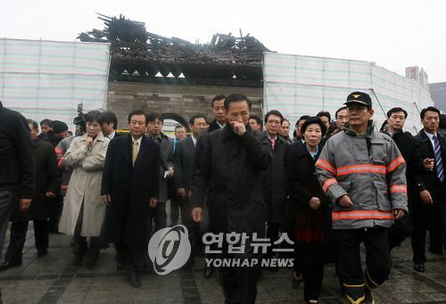 據(jù)韓聯(lián)社報(bào)道,李明博于當(dāng)天上午改變?cè)ㄈ粘,與政權(quán)接管委員會(huì)委員長(zhǎng)李慶淑和副委員長(zhǎng)金炯旿等人訪問了崇禮門,在視察化成灰燼的“國(guó)寶一號(hào)”火災(zāi)現(xiàn)場(chǎng)期間李明博始終表情沉重,一言不發(fā)。