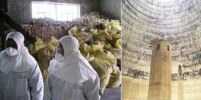 左圖為,為了核去功能化解除的隔熱磚,右圖為,已被虛空的冷卻塔內(nèi)部。