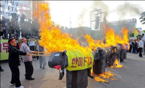 上百名游行示威者在首爾市中心燭光守夜,抗議李明博政府恢復(fù)進(jìn)口美國牛肉,漠視民眾對瘋牛病的擔(dān)心。警察隨即驅(qū)散游行者,并以非法占用街道需接受審訊為由逮捕了37名拒絕驅(qū)散者。