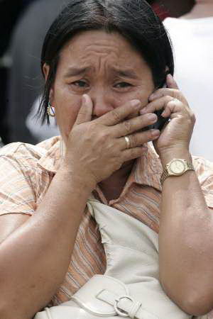 “群星公主”號(hào)渡輪乘客和船員親屬在宿務(wù)等待消息時(shí)對(duì)蘇爾皮西歐船運(yùn)公司的雇員尖叫。一位婦女對(duì)該公司的一名雇員稱:“你無法讓我們的親人回來,你應(yīng)當(dāng)對(duì)此負(fù)責(zé)!碧K爾皮西歐船運(yùn)公司稱,它將向每位遇難者的家屬支付20萬比索(4500美元)的賠償,向幸存者支付一定數(shù)量的金錢。(黃歡)