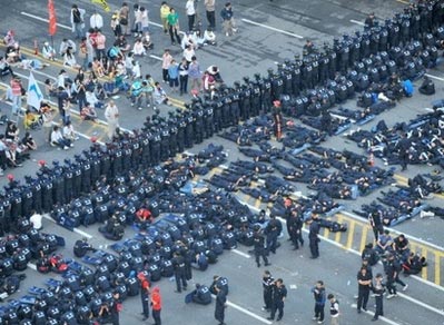 25日晚,由3千多人組成的示威隊(duì)在首爾德壽宮大漢門(mén)前廣場(chǎng)舉行“反對(duì)強(qiáng)行刊登告示”燭光集會(huì),并向青瓦臺(tái)方向挺進(jìn),他們?cè)谝恍┞范闻c警方對(duì)峙到26日凌晨,同時(shí)發(fā)生了多起示威隊(duì)與警方?jīng)_突的事件。