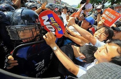 韓國(guó)防暴警察與抗議政府恢復(fù)進(jìn)口美國(guó)牛肉的民眾對(duì)峙。