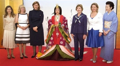 出席日本北海道八國(guó)集團(tuán)峰會(huì)的各國(guó)首腦的夫人們觀看如何穿著“十二單”和服。
