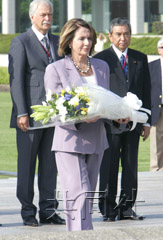美國眾院議長佩洛西向廣島核爆紀(jì)念碑獻(xiàn)花。后排右側(cè)為日本眾院議長河野洋平。