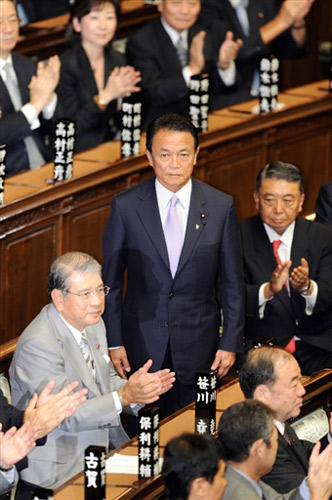 當(dāng)?shù)貢r(shí)間24日13點(diǎn)30分,兩天前剛剛當(dāng)選自民黨總裁的麻生太郎在眾議院全體會議上以337票被指定為第92任日本總理大臣。參議院隨后召開全體會議進(jìn)行首相提名選舉,民主黨黨首小澤一郎當(dāng)選。根據(jù)眾院表決結(jié)果優(yōu)先的日本憲法規(guī)定,麻生太郎經(jīng)兩院協(xié)商后確定出任首相。