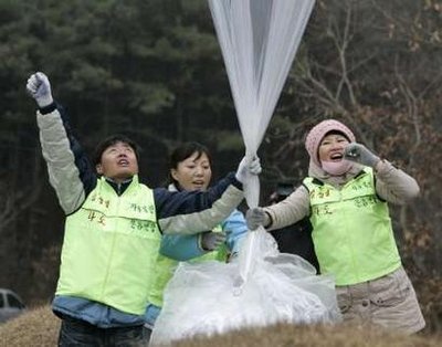 10名韓國活躍人士周四(20日)放出10個氦氣球,每個氣球掛了1萬張批評金正日的傳單。
