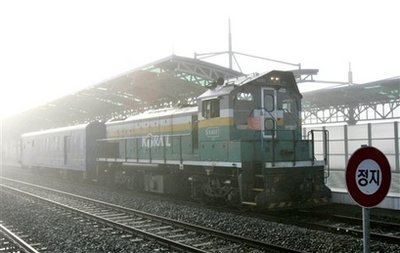 最后一班從韓國開往朝鮮的列車比原定時間延誤了40分鐘,從軍事分隔區(qū)前的都羅山站開出。