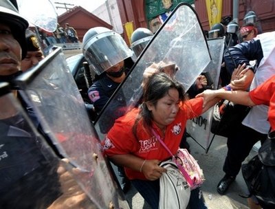 示威者投擲鐵欄泄憤,有人用磚砸爛議員的汽車,防暴警察組成人鏈,防止示威者沖擊。一名記者鼻梁被石擊中,一名防暴警察頭部也受傷,警方一度要增援。示威者其后散去。據(jù)報,他信的支持者亦在東北部多個省分示威,抗議阿披實當(dāng)選。