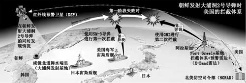 此外,韓國(guó)軍方預(yù)測(cè),朝鮮如果發(fā)射能夠威脅美國(guó)本土的大浦洞2號(hào)改良型導(dǎo)彈,美國(guó)將分兩個(gè)階段予以攔截。大浦洞2號(hào)導(dǎo)彈發(fā)射后,朝鮮半島上空的美國(guó)紅外線(xiàn)預(yù)警衛(wèi)星(DSP)將首先發(fā)現(xiàn)情況。導(dǎo)彈尾部的火焰在太空中也能得到確認(rèn)。預(yù)警衛(wèi)星將向美國(guó)的所有導(dǎo)彈防御體系發(fā)送警報(bào)。導(dǎo)彈升空后,第一階段的攔截體系開(kāi)始運(yùn)作。位于東海的美國(guó)海軍宙斯盾艦將通過(guò)相控陣?yán)走_(dá)實(shí)時(shí)預(yù)測(cè)導(dǎo)彈的軌跡。如果大浦洞2號(hào)導(dǎo)彈接近日本列島,宙斯盾艦將發(fā)射SM-3導(dǎo)彈進(jìn)行攔截。美國(guó)第7艦隊(duì)擁有夏洛號(hào)巡洋艦(CG-67)和斯特塞姆號(hào)驅(qū)逐艦(DDG-63)等九艘宙斯盾艦,一次可以發(fā)射多枚SM-3導(dǎo)彈。盡管日本海上自衛(wèi)隊(duì)的宙斯盾艦上也裝備有SM-3導(dǎo)彈,但是由于日本的和平憲法禁止自衛(wèi)隊(duì)在日本境外使用武器,所以在攔截導(dǎo)彈問(wèn)題上受到了限制。