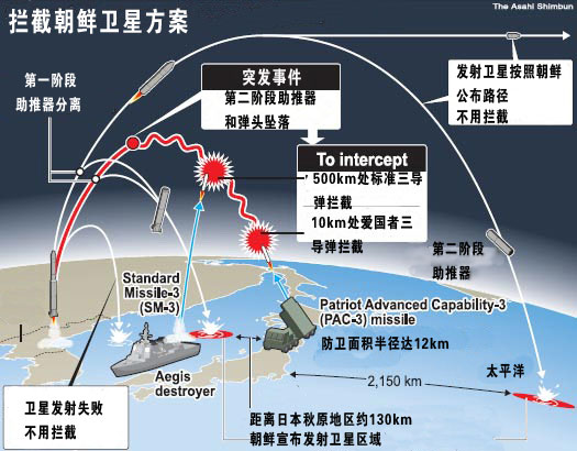 《朝日新聞》報(bào)道稱,日本已經(jīng)分別在驅(qū)逐艦上布署了海基型“標(biāo)準(zhǔn)三型(SM3)”防空導(dǎo)彈和陸基型“愛國者三型(P3C)”地對(duì)空導(dǎo)彈。在裝備有“宙斯盾”作戰(zhàn)系統(tǒng)的驅(qū)逐艦上部署了;汀皹(biāo)準(zhǔn)三型(SM3)”防空飛彈,這種飛彈采用熱導(dǎo)技術(shù)探測目標(biāo),可以在目標(biāo)的預(yù)定軌道上等待。一旦發(fā)現(xiàn)可疑目標(biāo),便將其擊落。如果海基標(biāo)準(zhǔn)三型飛彈攔截行動(dòng)失敗,雷達(dá)將引導(dǎo)陸基愛國者三型導(dǎo)彈實(shí)施第二次攔截,擊落目標(biāo)。