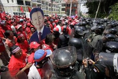 10日上午,泰國(guó)反獨(dú)裁民主聯(lián)盟的示威者穿過(guò)了泰國(guó)警方在東盟與對(duì)話(huà)國(guó)系列會(huì)議會(huì)場(chǎng)外圍設(shè)制的多道警戒線,已在會(huì)場(chǎng)門(mén)口集結(jié)。
