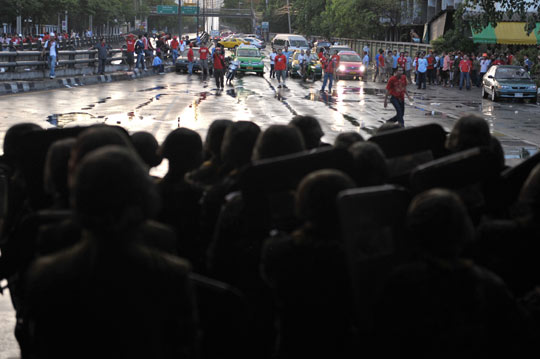 軍方凌晨開始對(duì)占據(jù)曼谷勝利紀(jì)念碑主要路口的示威者采取驅(qū)散行動(dòng),引發(fā)激烈沖突。沖突點(diǎn)距離“紅衫軍”抗議主場(chǎng)——曼谷總理府——只有數(shù)公里。軍方和示威者以催淚瓦斯、實(shí)彈和汽油彈互相攻擊。至中午時(shí)分,軍方向市中心的示威者開槍并發(fā)射高壓水炮。