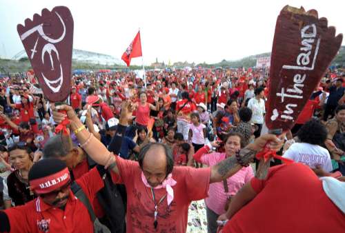 紅衫軍于周六黃昏五時起到曼谷皇家田廣場再次舉行反政府集會活動,約有數(shù)千人參加。
