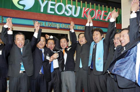 進入大會場的韓國代表團接到成功申博的消息后,在大會場旁邊焦心等待的申博團和助威團等600多人一齊高喊“萬歲”,慶祝麗水成功申辦世界博覽會。
