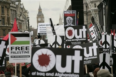 “停止戰(zhàn)爭聯(lián)盟”發(fā)言人表示:“伊拉克被占領(lǐng)的結(jié)果,是估計導(dǎo)致100萬人死于暴力!彼提到阿富汗戰(zhàn)事,指布朗不斷增兵阿富汗,可能成為另一場像伊拉克的災(zāi)難。格拉斯哥亦有幾百名示威者高舉“撤出伊拉克和阿富汗”的標語牌。
