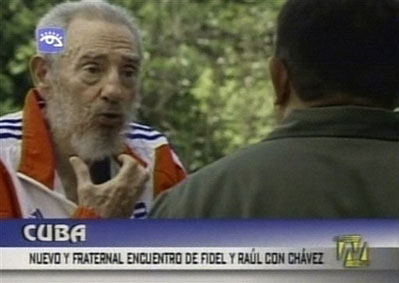中新網(wǎng)6月18日電 綜合報道,古巴前領(lǐng)導(dǎo)人菲德爾·卡斯特羅與委內(nèi)瑞拉總統(tǒng)查韋斯會談的畫面17日出現(xiàn)在古巴電視臺上。這是他半年來首次出現(xiàn)在錄像節(jié)目中?ㄋ固亓_看上去健康狀況良好。