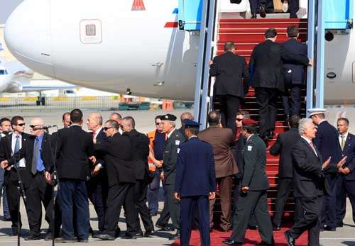 剛剛結(jié)束對(duì)以色列訪問(wèn)的薩科齊夫婦以及隨訪的法國(guó)官員正同以色列總統(tǒng)佩雷斯和總理奧爾默特等人握手告別。法國(guó)安全人員突然涌過(guò)來(lái)讓薩科齊夫婦迅速上飛機(jī),而以色列安全人員也迅速轉(zhuǎn)移了佩雷斯和奧爾默特。