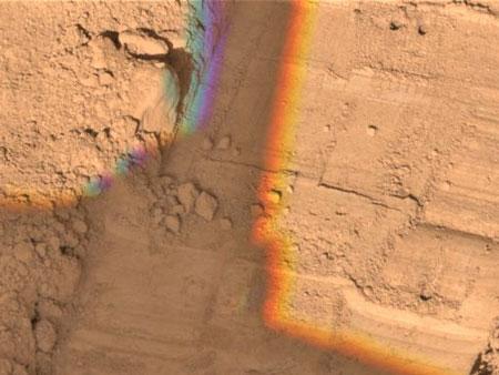 “鳳凰”號在火星表面取樣時鉆出的兩個小洞(左上角)