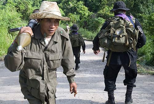 柬埔寨一名士兵攜帶一個火箭發(fā)射器與泰國的士兵擦身而過。
