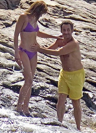 薩科齊夫婦當(dāng)時正在法國里維埃拉的家庭別墅度假。照片中的布呂尼身穿一件紫色比基尼,53歲的薩科齊則穿著一件黃色泳褲,他親吻了布呂尼并溫柔地?fù)崦紖文岬母共俊?/p>