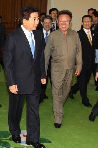 資料圖:去年10月3日,韓國總統(tǒng)盧武鉉與朝鮮國防委員長(zhǎng)金正日舉行首次首腦會(huì)談時(shí),就金正日前一天親自出來迎接表達(dá)謝意,而金正日對(duì)此以“我又不是患者”來回應(yīng),再次表現(xiàn)出其幽默的一面。