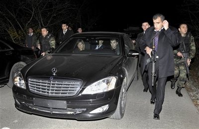 載有薩卡什維利的汽車(chē)在大批保安掩護(hù)下撤離槍擊事件現(xiàn)場(chǎng)。