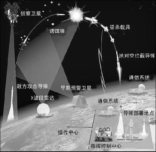 根據(jù)對(duì)來(lái)襲導(dǎo)彈進(jìn)行攔截的時(shí)機(jī)不同,彈道導(dǎo)彈防御系統(tǒng)通常可被劃為三大類!爸贫巍狈烙到y(tǒng)是指在助推階段對(duì)來(lái)襲導(dǎo)彈進(jìn)行攔截,一般在導(dǎo)彈發(fā)射后、尚未投放彈頭的數(shù)分鐘內(nèi)進(jìn)行攔截!澳┒巍狈烙到y(tǒng)是指在彈道飛行最后階段,即在來(lái)襲導(dǎo)彈再進(jìn)入大氣層并即將擊中目標(biāo)時(shí),對(duì)來(lái)襲導(dǎo)彈進(jìn)行攔截。“中段”防御系統(tǒng)的攔截范圍是以上兩者之間的廣大區(qū)域,旨在對(duì)脫離導(dǎo)彈彈體后尚未再入大氣層、處于太空真空飛行狀態(tài)的來(lái)襲彈頭進(jìn)行攔截。從美軍建設(shè)導(dǎo)彈防御的進(jìn)程來(lái)看,目前,美軍已經(jīng)具備了對(duì)“中段”和“末段”的初步攔截能力!爸卸巍睌r截武器以美軍部署在太平洋上的“宙斯盾”級(jí)導(dǎo)彈驅(qū)逐艦和巡洋艦以及部署在阿拉斯加格里利堡的陸基中層攔截導(dǎo)彈為主,“末段”攔截武器以部署在美國(guó)境內(nèi)的“愛(ài)國(guó)者-3”型導(dǎo)彈為主。