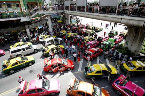 交通警察稱,出租車司機也參與了示威活動,導致曼谷中心地區(qū)至少一處主要樞紐地帶被堵,勝利紀念碑附近水泄不通。阿披實政府目前拒絕使用武力驅(qū)散示威者。