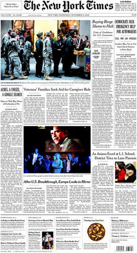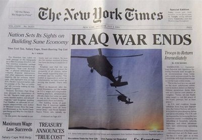 一個專門開展惡作劇活動的美國組織12日印刷了120萬份偽造的《紐約時報》。這份堪稱“惡搞杰作”《紐約時報》共有14版,無論是報頭還是字體字型,都和真正的《紐約時報》一模一樣,乍看上去簡直真假難辨。不過,這份報紙標明的出版時間為2009年7月4日,其頭條竟然是:伊拉克戰(zhàn)爭結(jié)束了。