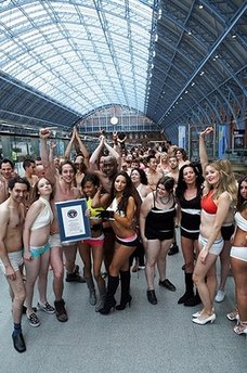 在倫敦的圣潘克拉斯車站,尋求締造最多人聚在一起僅身穿內(nèi)衣的世界紀(jì)錄,同時(shí)有數(shù)百人脫得只剩內(nèi)衣,民眾不禁側(cè)目(見圖)。